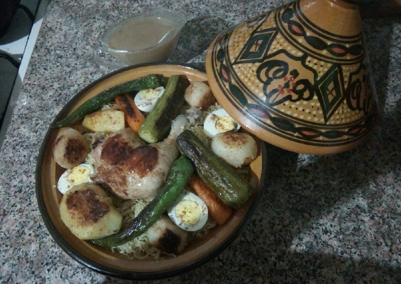 - Au même temps, préparez la sauce, ajoutez l'huile et le beurre et colorer les morceaux de volailles, ajoutez l'oignon et l'eau tiède. Pelez les légumes, puis les ajoutez au sauce blanche, mettez le pois chiche et les épices.