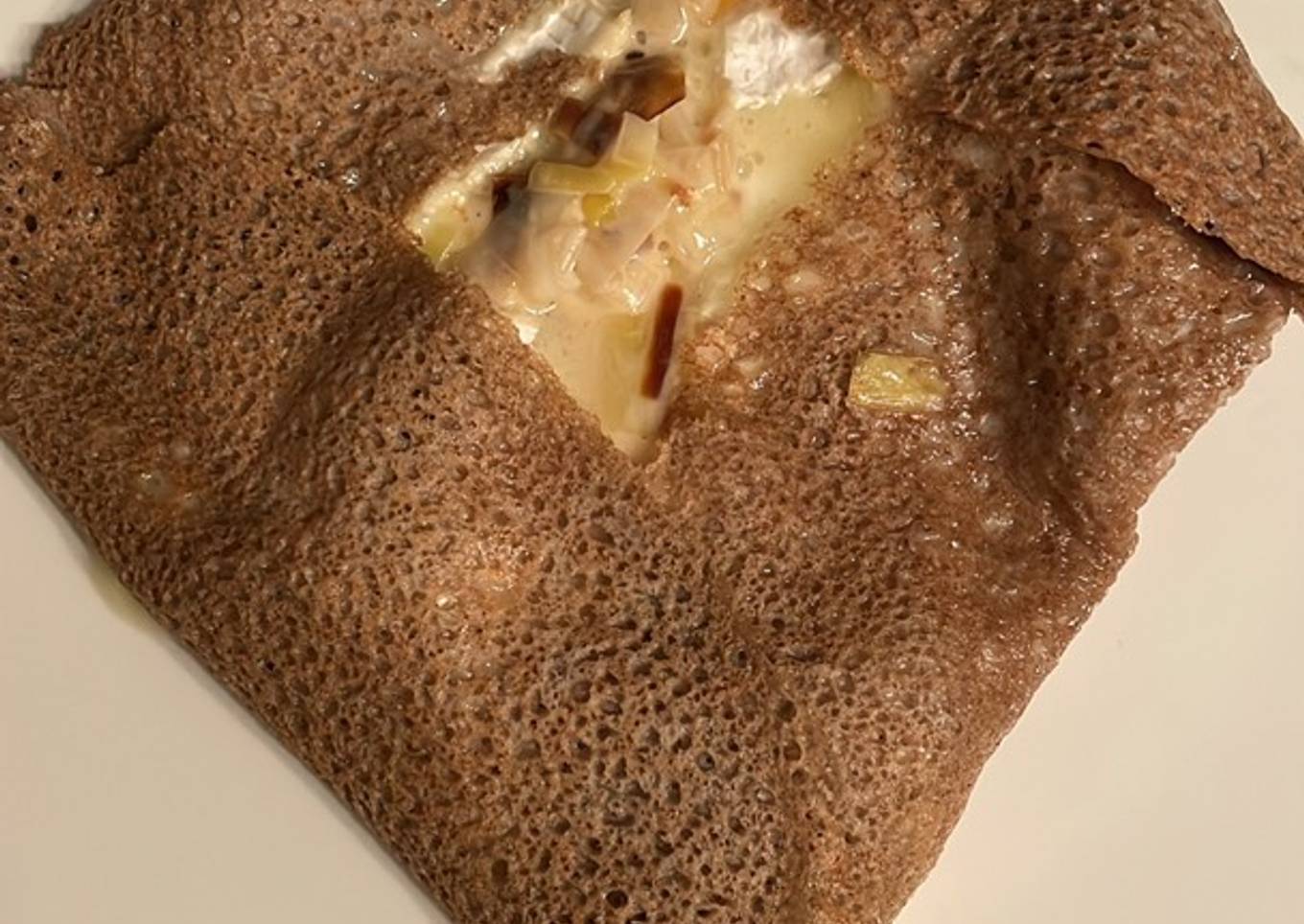 - Dans une poêle, ajouter une noisette de beurre et déposer la galette. Ajouter la moitié de la fondue de poireaux, des tranches de camembert. Poivrer. Refermer la galette et laisser mijoter à couvert 2/3 minutes jusqu’à ce que le camembert soit fondu. Déguster avec une salade.