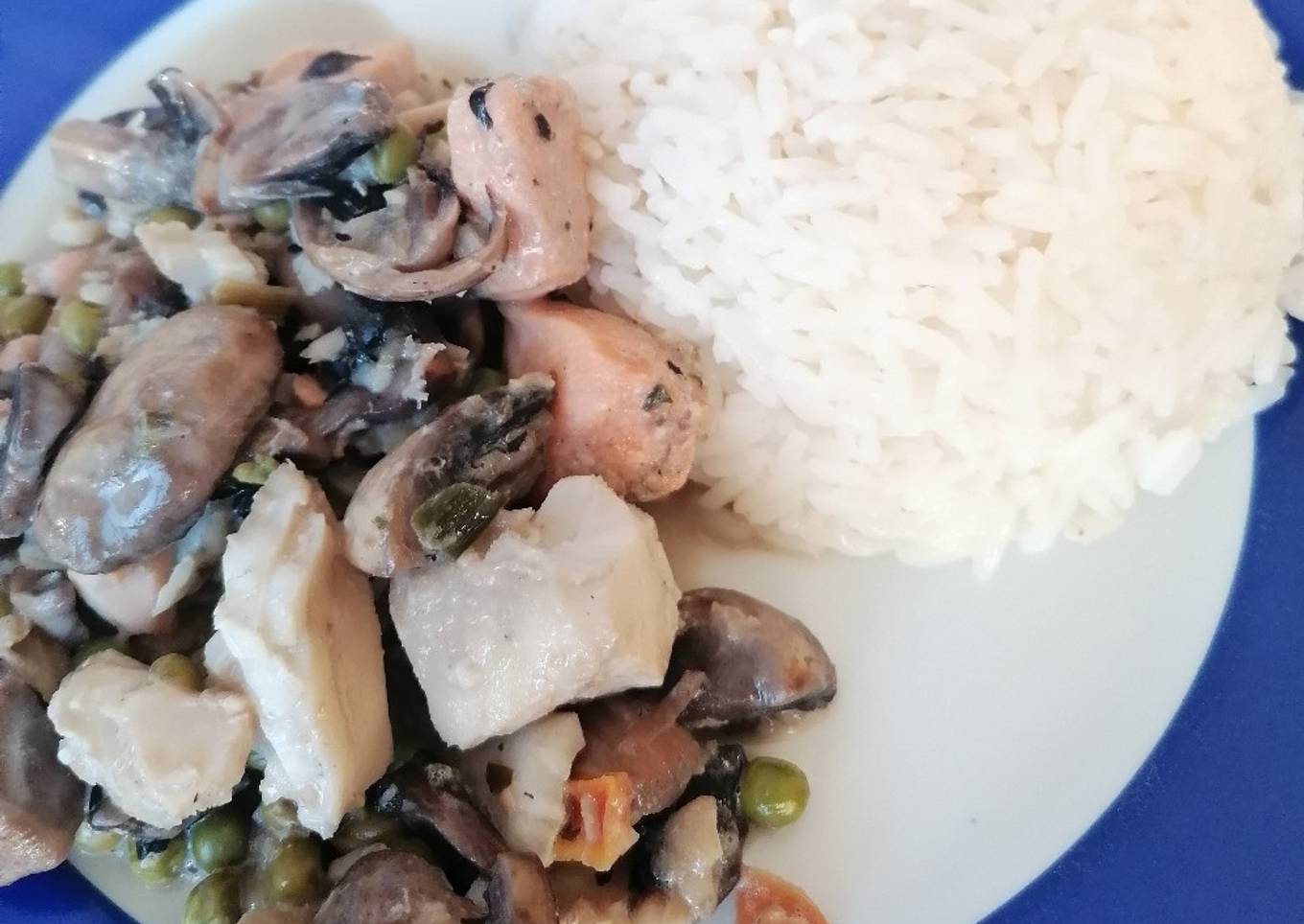 - Quand l'eau bout, ajouter les petits pois avec les champignons. Puis quelques minutes plus tard, ajouter le poisson. En fin de cuisson